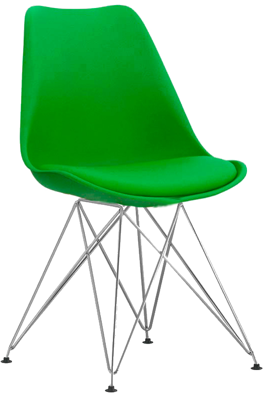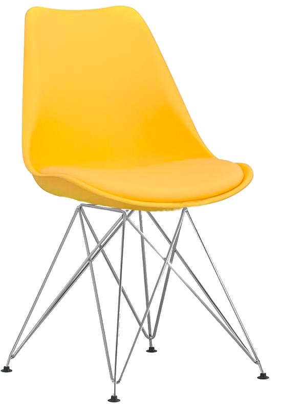 Structure en métal chromé, coque en polypropylène, coussins en cuir synthétique