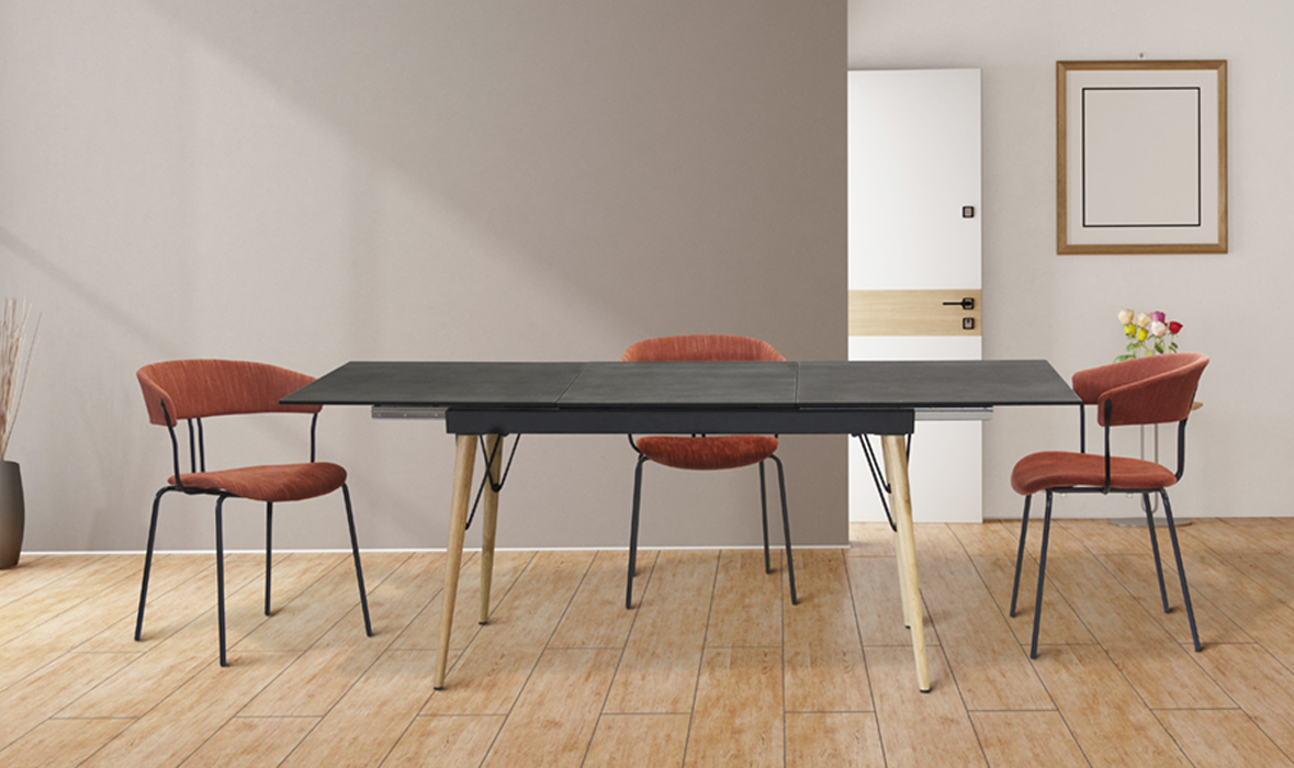 Struttura in metallo verniciato, gambe in legno di faggio, piano allungabile in cristallo effetto pietra, spessore 10,5 mm.