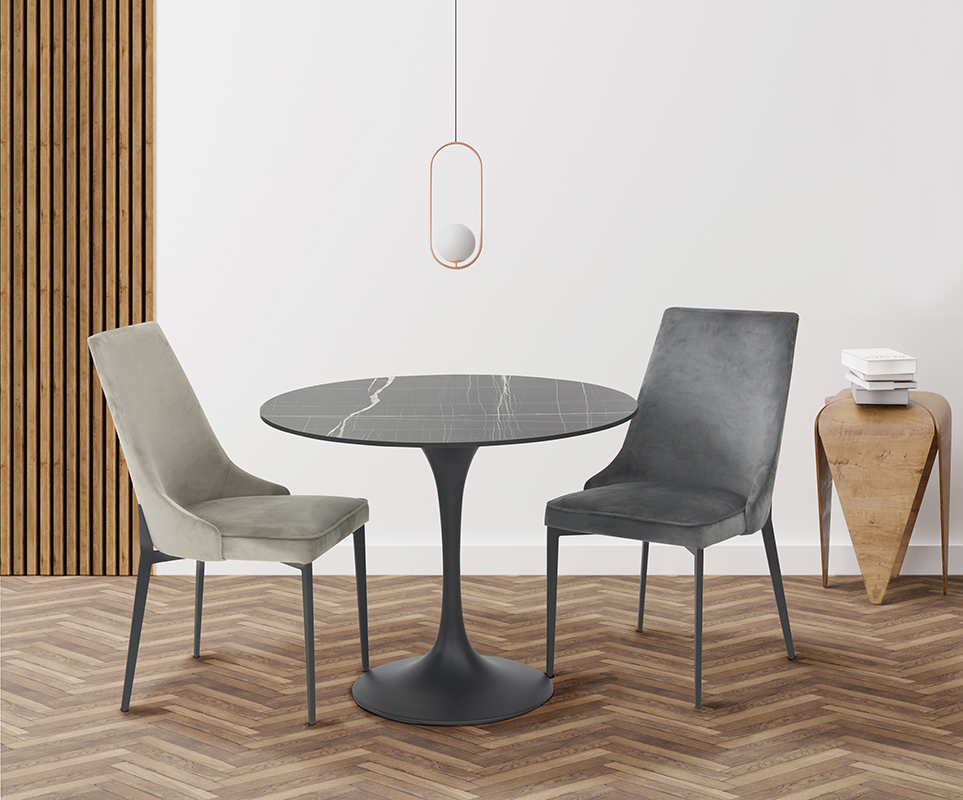Struttura in metallo verniciato, seduta e schienale imbottiti, rivestimento in tessuto