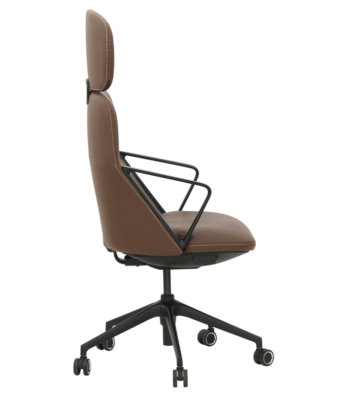 Structure en aluminium peint, assise et dossier rembourrés, revêtus de simili cuir. Avec appui-tête. Hauteur réglable avec dossier réglable, mécanisme escamotable.